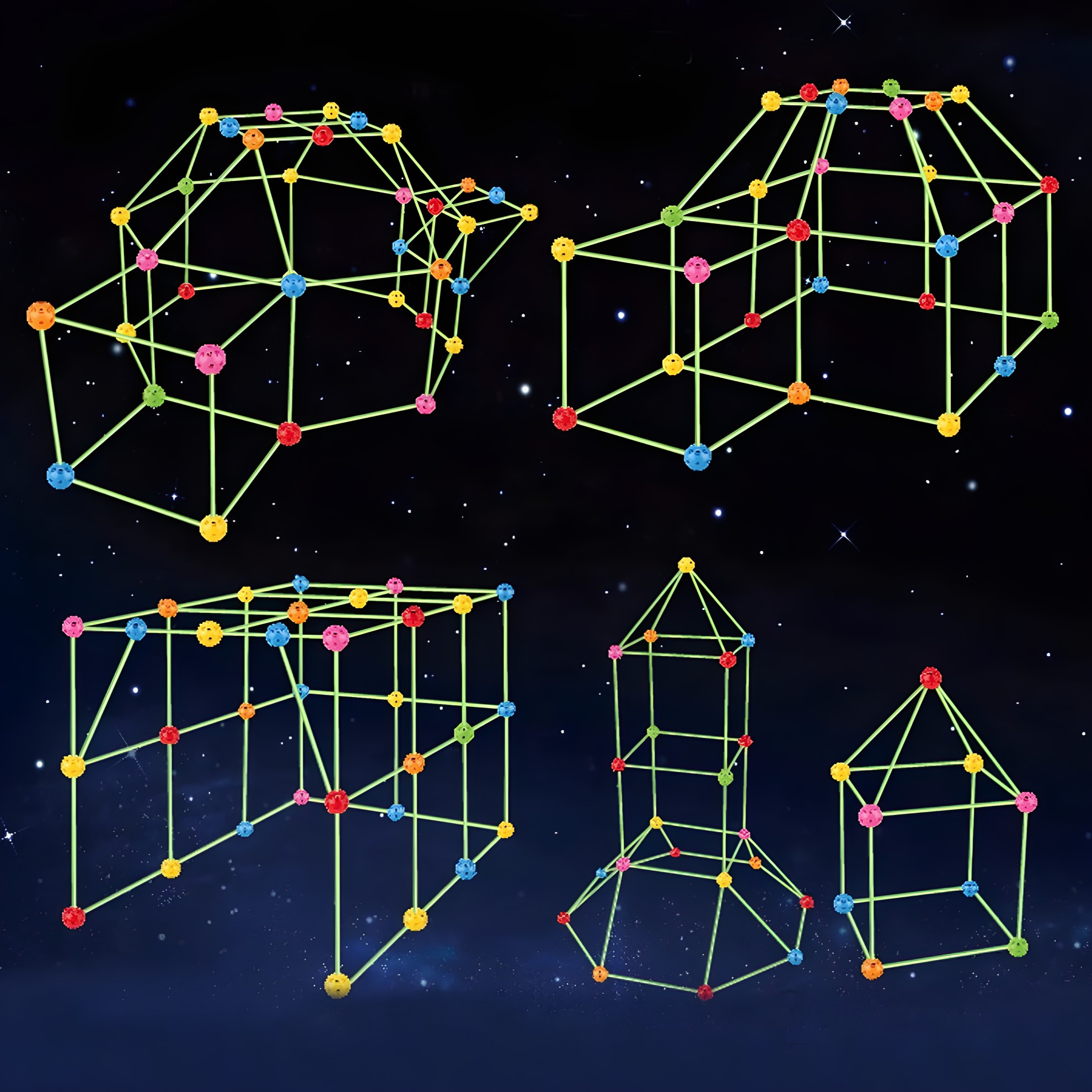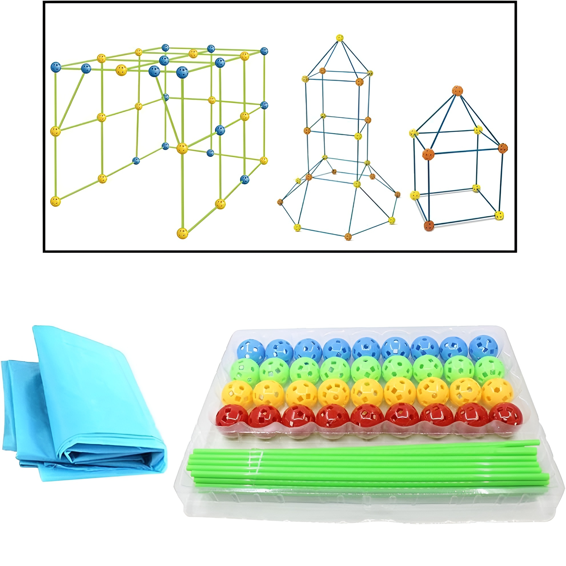 Uz ovaj set, deca mogu da naprave sopstveni zamak, šator ili pećinu – koristeći štapiće i spojne loptice koje svetle u mraku.