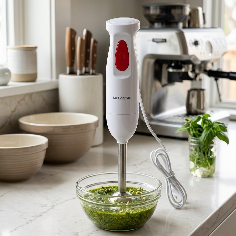 MClassic ručni blender je kompaktan i snažan pomoćnik koji ti omogućava da brzo izblendaš supu, napraviš smuti ili usitni sastojke – jednostavno i bez nereda.